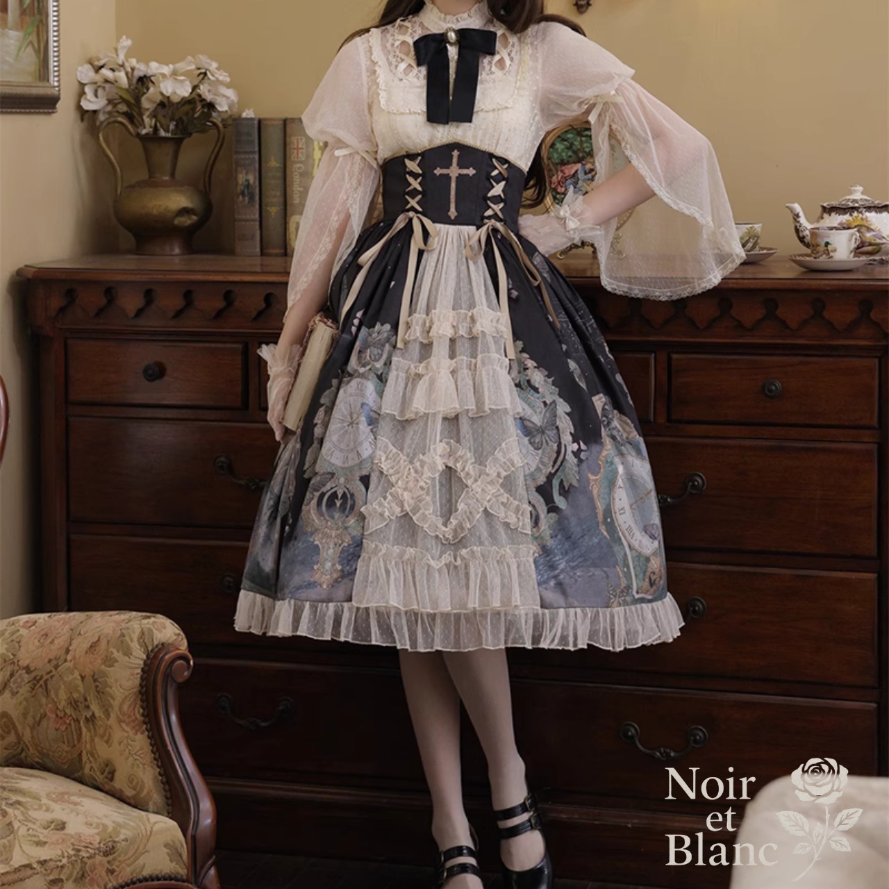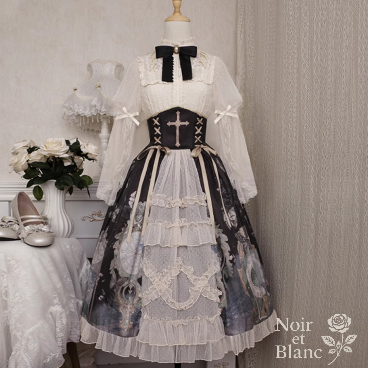 中世ヨーロッパの教会を思わせる荘厳な雰囲気と、可憐なロリィタ要素が絶妙に調和したジャンパースカート。