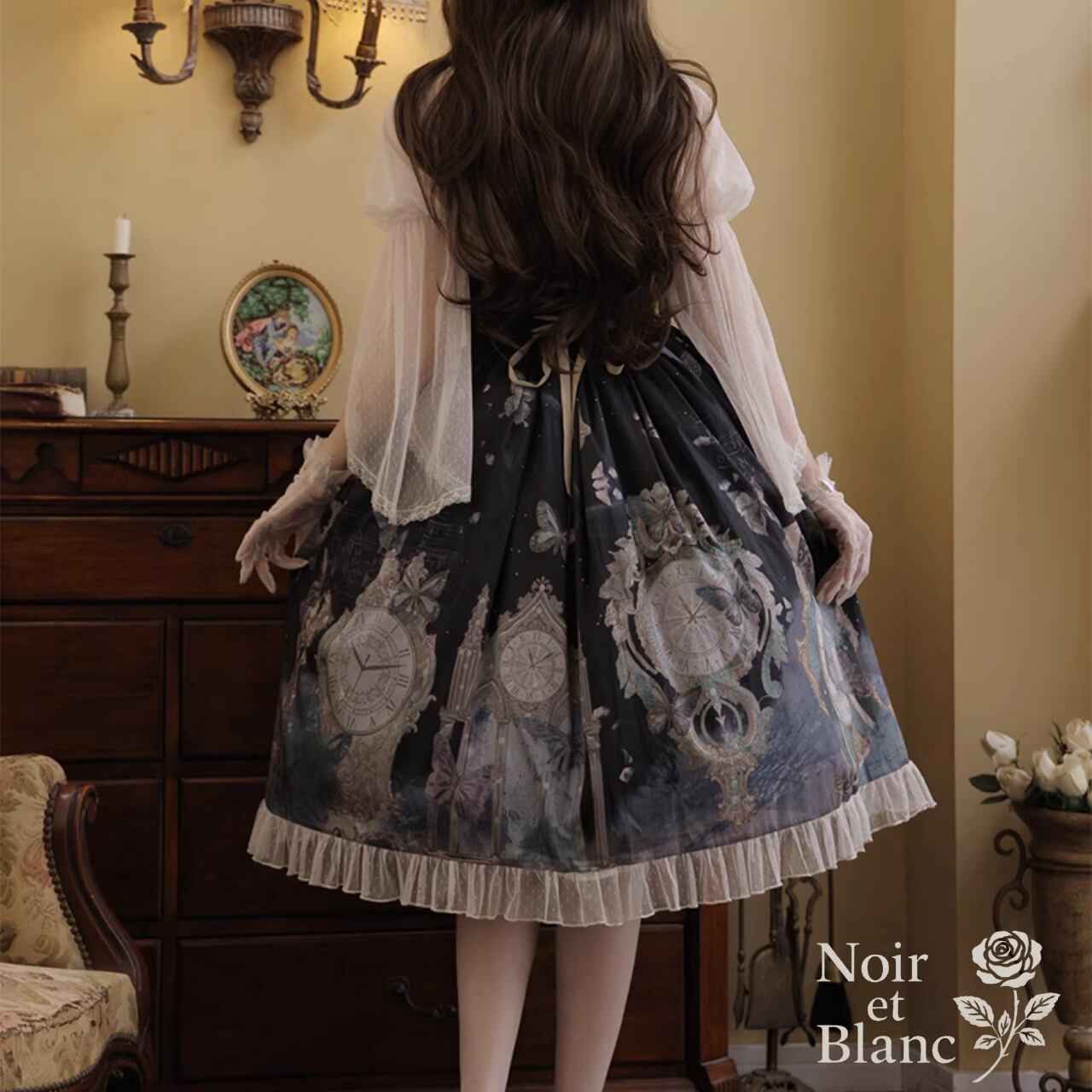 ・時計塔や蝶を描いた幻想的なプリントスカート