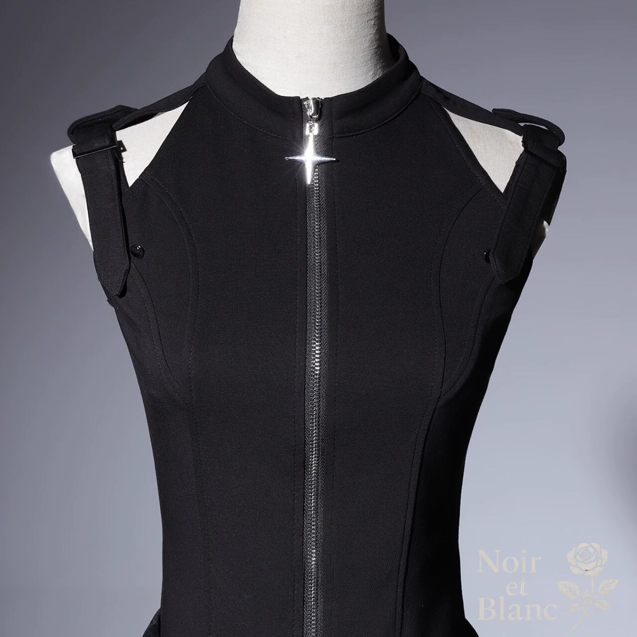 ・ジップアップ仕様のノースリーブトップでシャープな印象