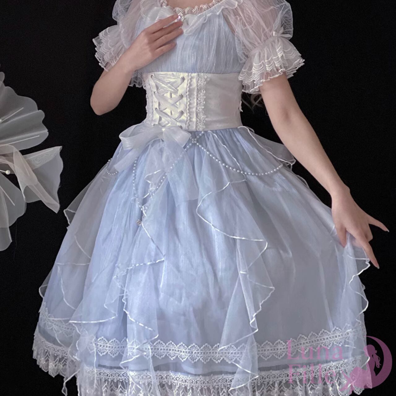 ロリータワンピース, コルセットワンピース, アイスブルー, レース, フリル袖, パールビーズ, クラシカル, スウィートロリータ, ティーパーティー, 発表会ドレス