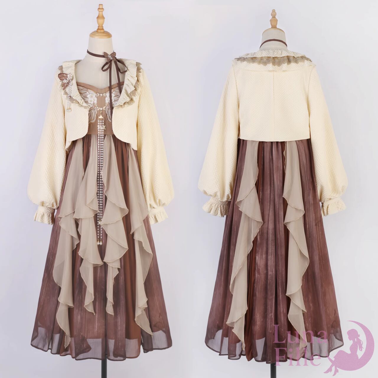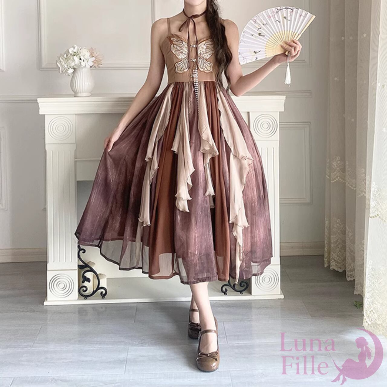 柔らかなモカ×ベージュ配色に、胸元のバタフライ刺繍とロングタッセルがアクセント。段々シフォンのレイヤードスカートが軽やかに揺れ、ふくらはぎ〜足首の上品丈。後ろはシャーリング+リボン結びでフィット感を調整できます。立体フリルのショートボレロを重ねれば、きちんと見えのプリンセスコーデに。
