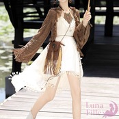 アイボリーのワンピースに、前短め・後ろ長めのハイロー裾とタッセル飾りをプラス。軽やかなレイヤードが動くたびに表情をつくり、ブラウンの透け感ボレロを重ねればこなれた森ガール風に。袖口のレースアップやアンティーク風ベルトチャーム(想定)がアクセントになり、デイリーから撮影会まで幅広く活躍します。