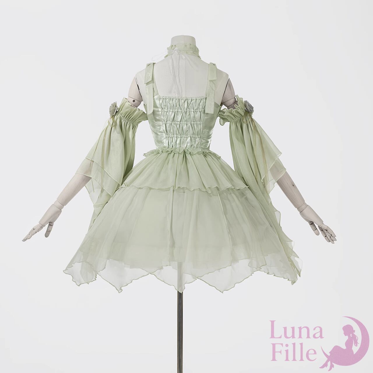 Luna Filleが贈る「翡翠の精霊ロリータドレス」は、淡いグリーンのシフォンが優しく揺れる幻想的な一着です。