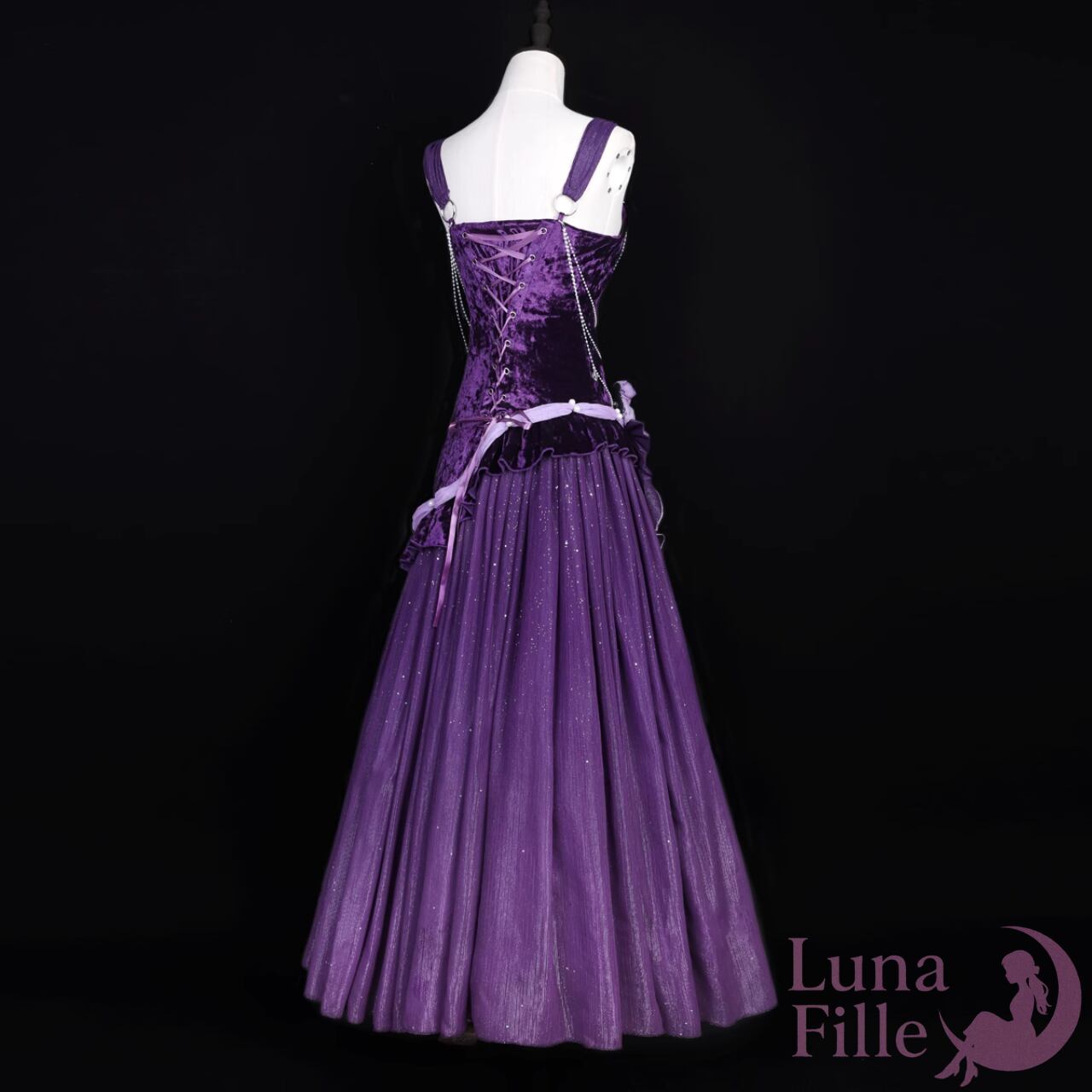 深みのあるパープルベルベットと、きらめくラメチュールが織りなすラグジュアリーなロリータドレスです。