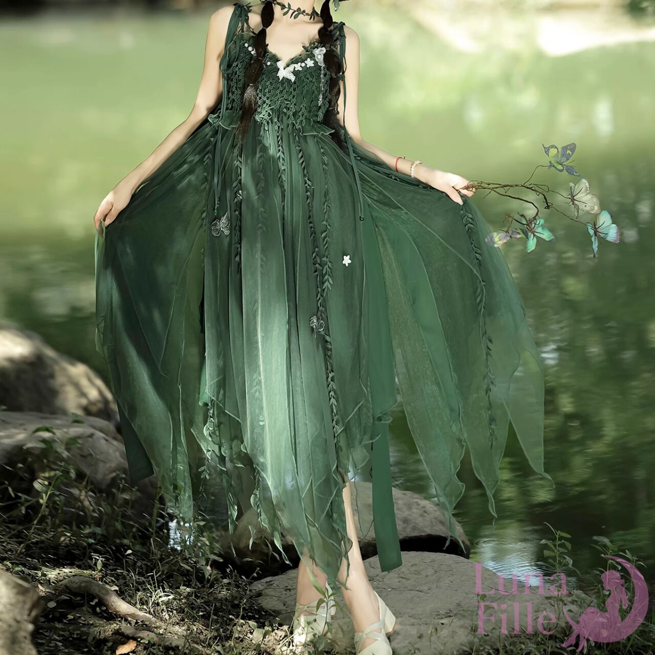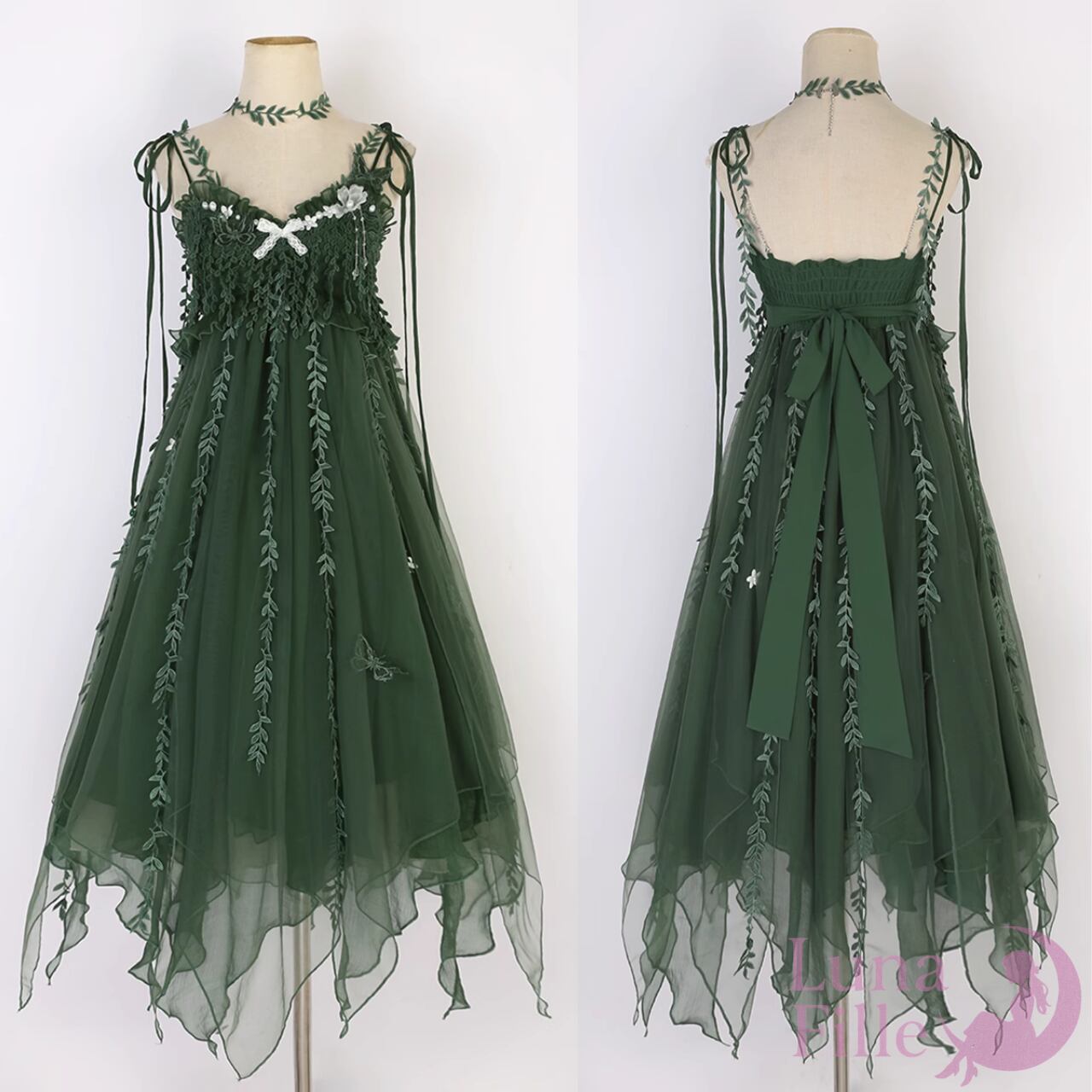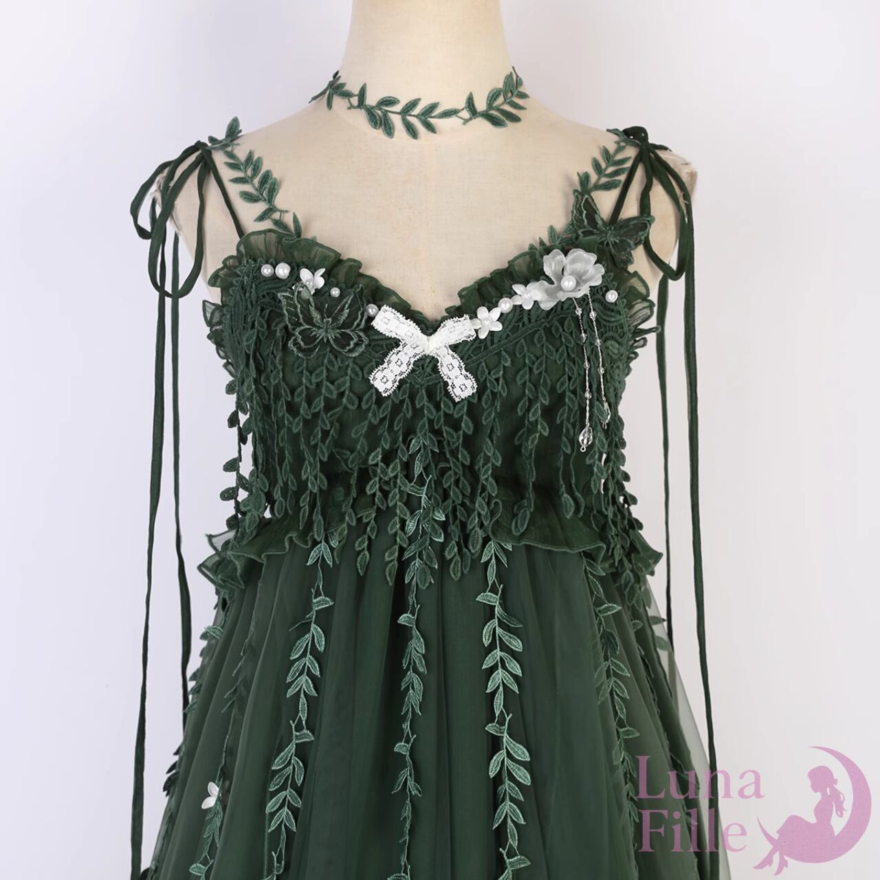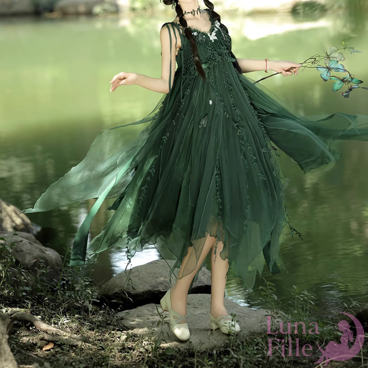 Luna Filleが贈る「フォレストフェアリードレス」は、深緑のシフォンが光と風をまとい、幻想的な存在感を放つ一着です。